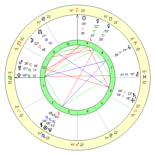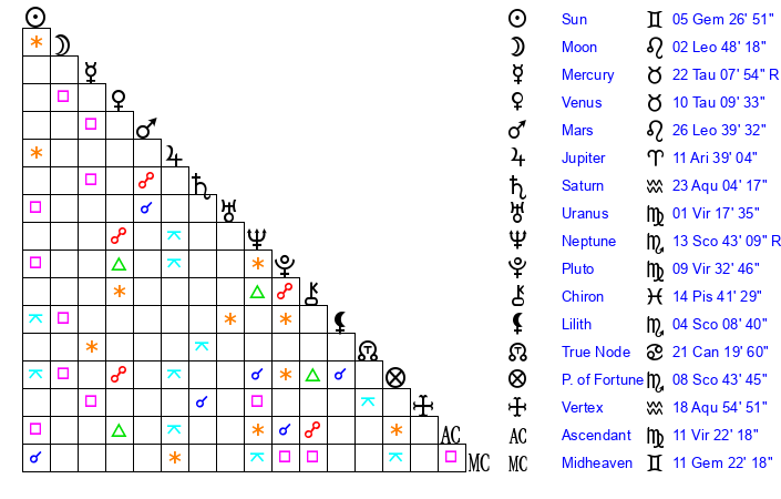 Sun | 5 Gemini 27 | 6 Gemini 25 | 4 Leo 39 |