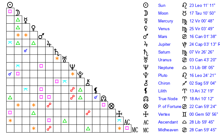 | Pluto | 16 Leo 24 | 2 Aquarius 4 | 18 Leo 6 |