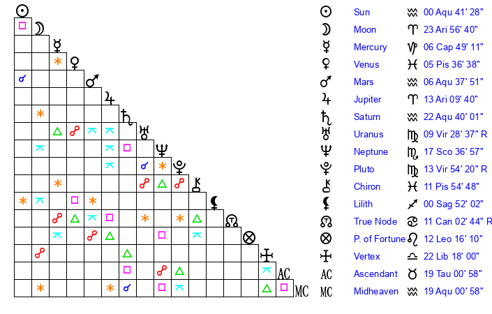 | Neptune | 17 Scorpio 36 | 27 Pisces 41 | 17 Scorpio 32 |
