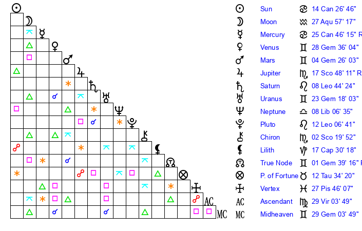 Pluto | 12 Leo 6 | 2 Aquarius 59 | 14 Leo 17 |