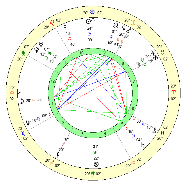 | Sun | 24 Cancer 10 | 24 Cancer 25 | 22 Virgo 52 |