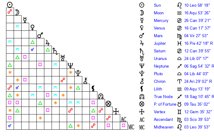| Sun | 10 Leo 58 | 11 Leo 36 | 0 Libra 16 |