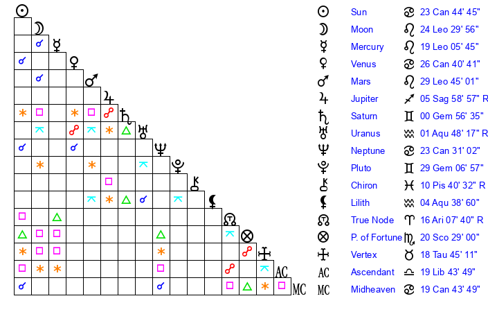 | Mercury | 19 Leo 6 | 15 Leo 29 | 2 Sagittarius 57 |