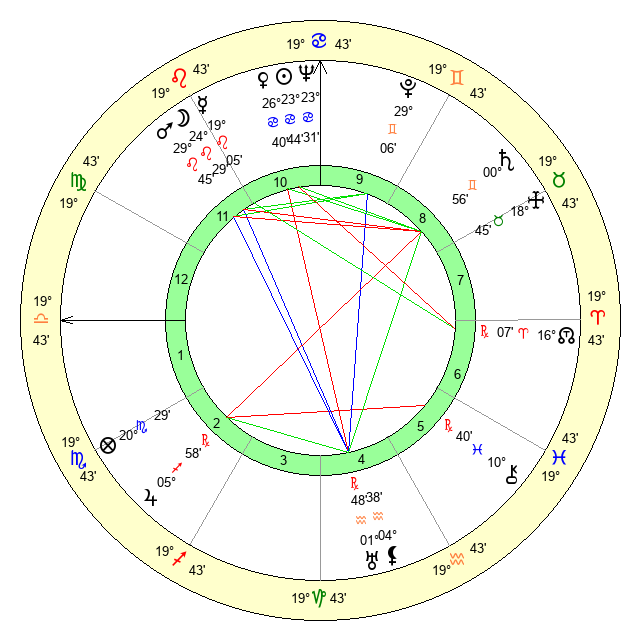 | Sun | 23 Cancer 45 | 24 Cancer 25 | 13 Scorpio 56 |