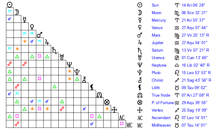 | Sun | 14 Aries 6 | 14 Aries 56 | 26 Gemini 38 |