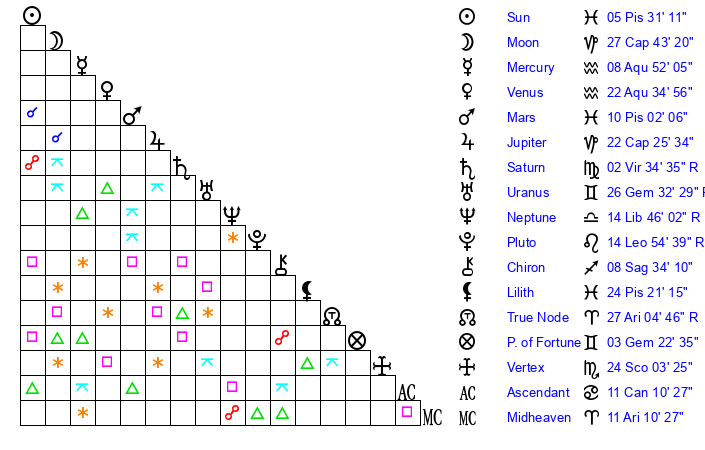 Jupiter | 22 Capricorn 21 | 11 Gemini 56 | 1 Aquarius 56 |