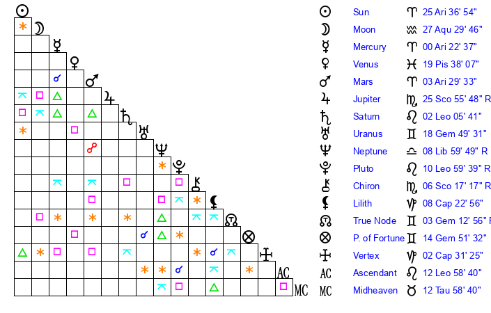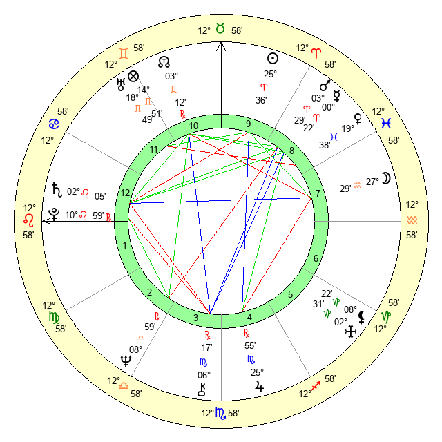 Pluto | 10 Leo 59 | 3 Aquarius 44 | 12 Leo 0 |