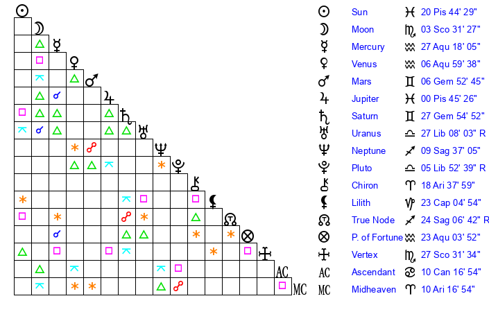 | Neptune | 9 Sagittarius 36 | 29 Pisces 17 | 8 Sagittarius 57 |