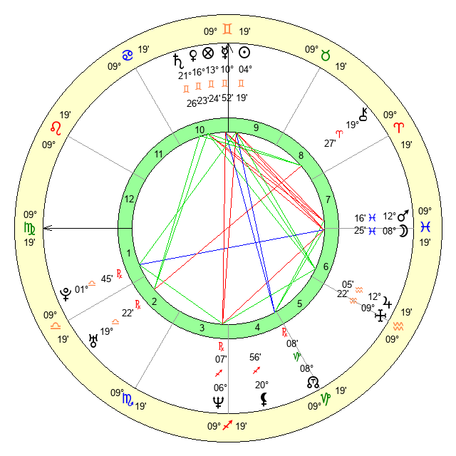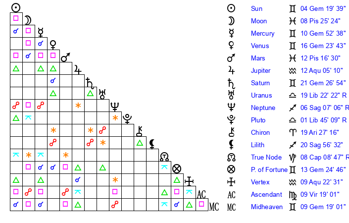 | Saturn | 21 Gemini 44 | 29 Pisces 56 | 28 Gemini 23 |