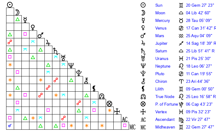 | Moon | 4 Libra 40 | 25 Sagittarius 28 | 22 Gemini 42 |