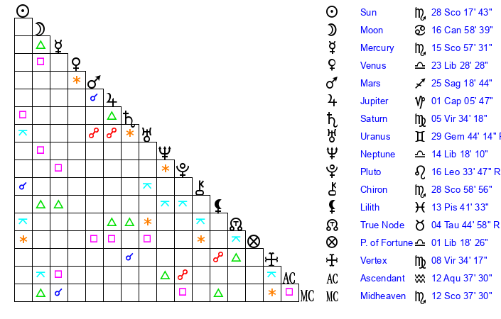 | Mercury | 15 Scorpio 58 | 27 Scorpio 52 | 10 Aquarius 2 |
