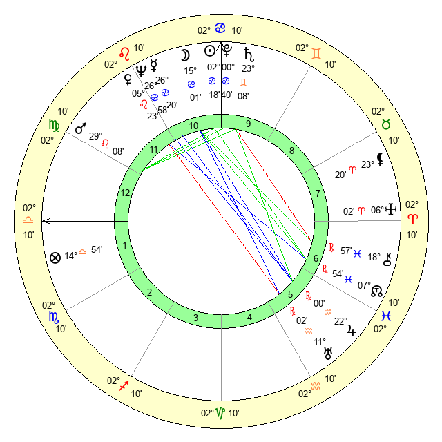 | Moon | 15 Cancer 9 | 23 Gemini 25 | 5 Leo 4 |