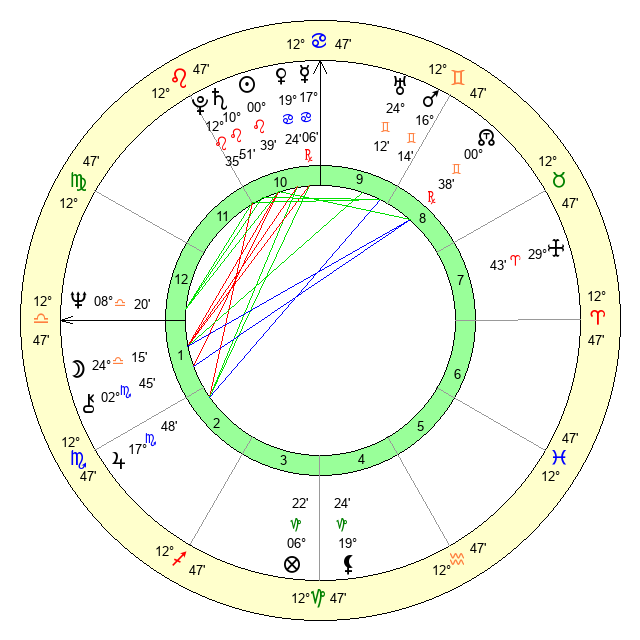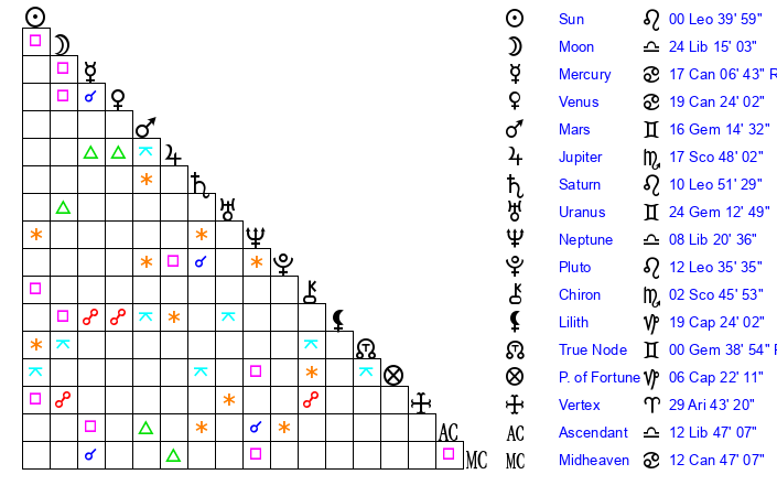 | Moon | 24 Libra 26 | 26 Cancer 43 | 25 Leo 47 |
