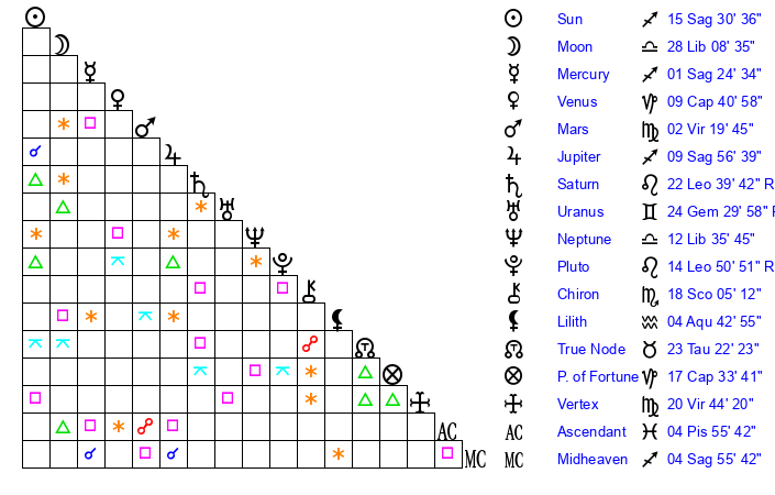 | Neptune | 12 Libra 36 | 29 Pisces 22 | 12 Libra 33 |
