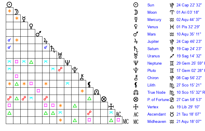 | Jupiter | 24 Capricorn 33 | 11 Gemini 56 | 16 Aquarius 24 |