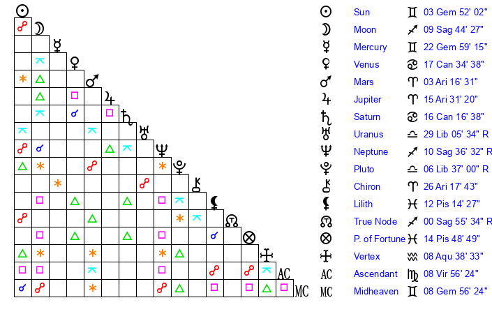 | Sun | 3 Gemini 51 | 4 Gemini 44 | 21 Cancer 37 |