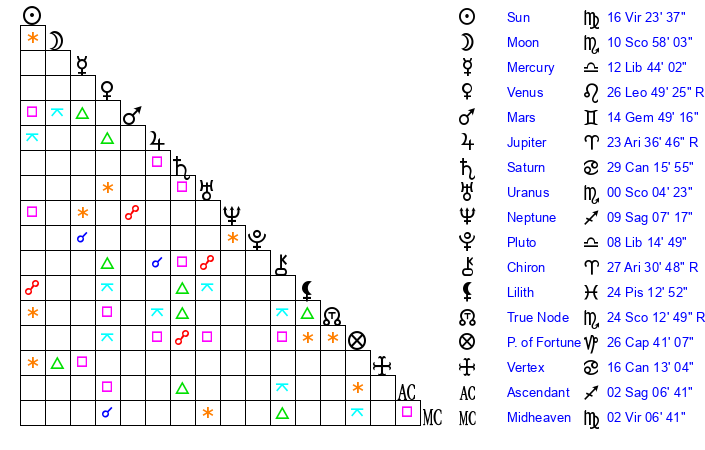 | Moon | 10 Scorpio 54 | 13 Aries 24 | 28 Leo 54 |