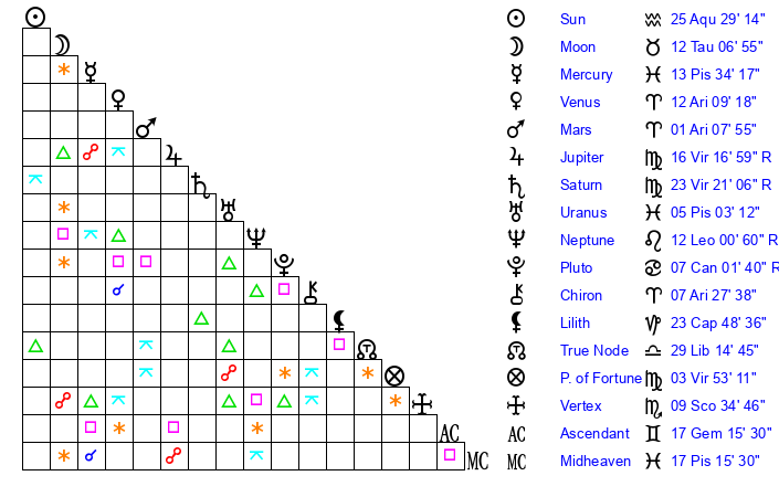| Moon | 12 Taurus 11 | 20 Virgo 25 | 5 Pisces 24 |