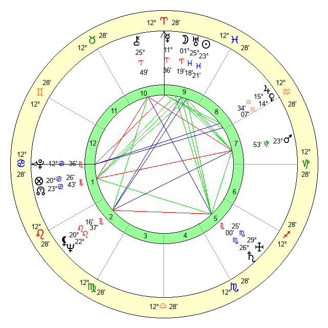 | Moon | 1 Aries 25 | 28 Virgo 52 | 6 Scorpio 27 |