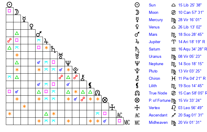 | Venus | 26 Libra 14 | 24 Virgo 31 | 13 Capricorn 28 |