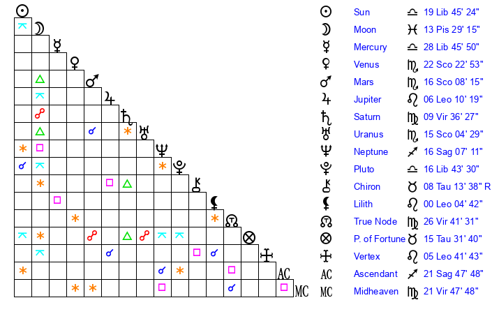 | Saturn | 9 Virgo 58 | 26 Pisces 45 | 13 Virgo 43 |