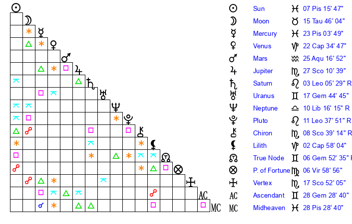 | Neptune | 10 Libra 16 | 28 Pisces 48 | 8 Libra 20 |