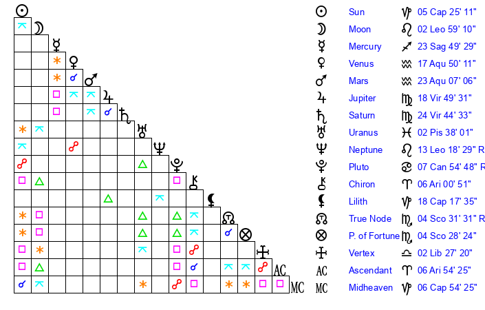 | Venus | 17 Aquarius 50 | 3 Capricorn 29 | 8 Taurus 15 |