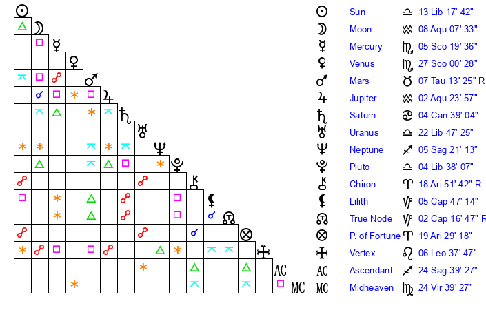 | Sun | 13 Libra 17 | 13 Libra 41 | 5 Sagittarius 19 |