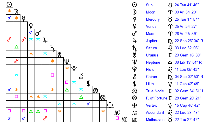 | Sun | 24 Taurus 42 | 25 Taurus 48 | 9 Leo 16 |