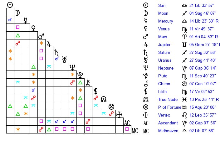 | Saturn | 27 Sagittarius 42 | 26 Pisces 40 | 0 Capricorn 59 |