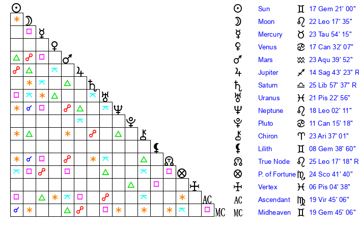 | Sun | 17 Gemini 21 | 17 Gemini 55 | 24 Virgo 16 |