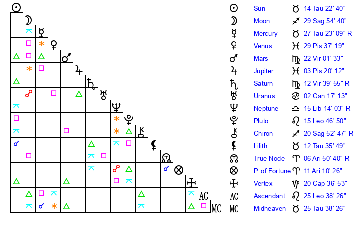 | Moon | 29 Sagittarius 55 | 25 Leo 36 | 17 Virgo 51 |