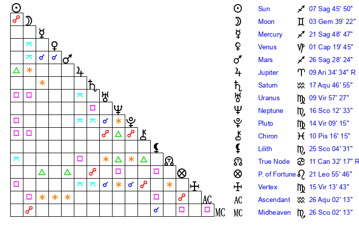 | Mars | 26 Sagittarius 29 | 19 Sagittarius 5 | 14 Aquarius 31 |