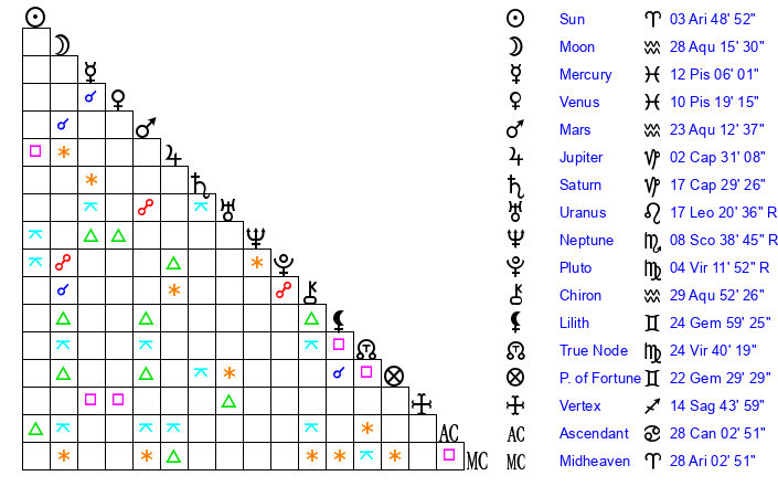 Moon | 28 Aquarius 15 | 27 Capricorn 25 | 9 Cancer 19 |