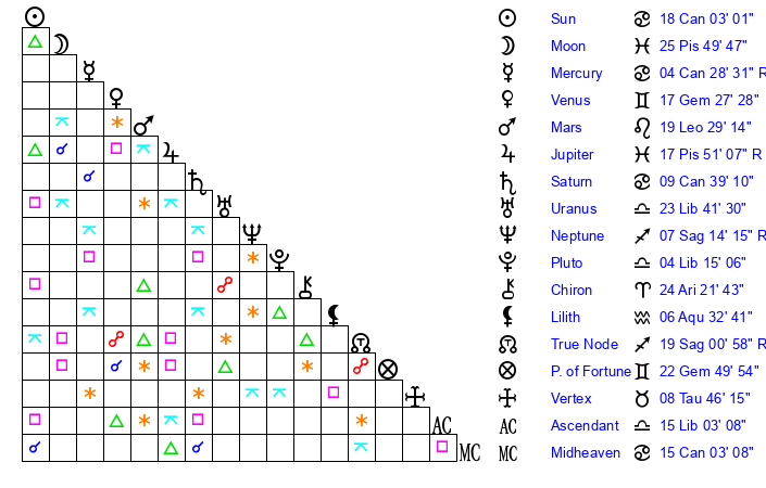 | Jupiter | 17 Pisces 40 | 7 Cancer 1 | 13 Pisces 29 |