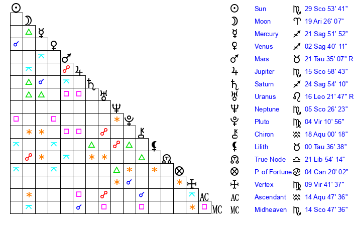 | Moon | 19 Aries 29 | 27 Sagittarius 9 | 27 Virgo 36 |