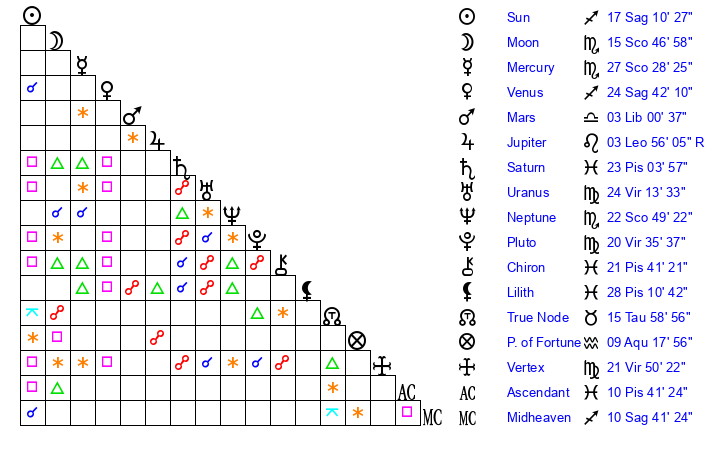 | Sun | 17 Sagittarius 11 | 17 Sagittarius 52 | 17 Aquarius 13 |