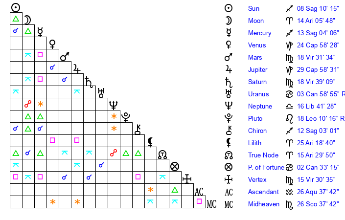 | Sun | 8 Sagittarius 10 | 8 Sagittarius 44 | 25 Aquarius 27 |