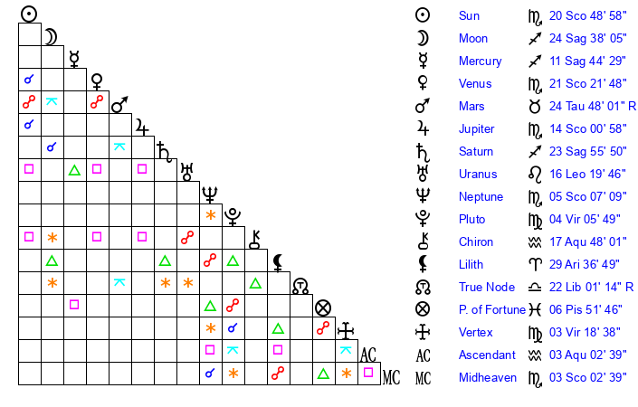 | Sun | 20 Scorpio 49 | 21 Scorpio 34 | 28 Capricorn 53 |