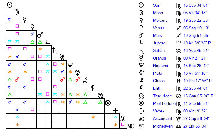 | Neptune | 15 Scorpio 26 | 29 Pisces 37 | 17 Scorpio 24 |