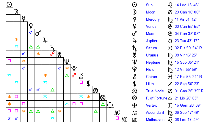 | Pluto | 12 Virgo 56 | 2 Aquarius 17 | 15 Virgo 2 |