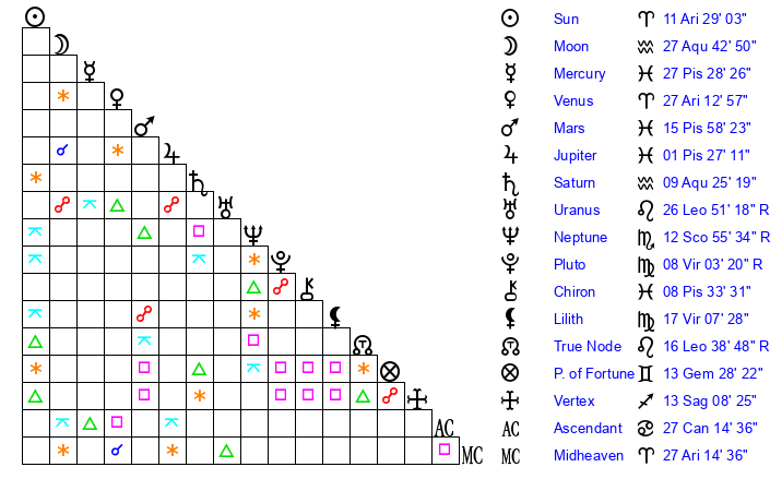 | Moon | 27 Aquarius 53 | 27 Taurus 52 | 27 Gemini 9 |