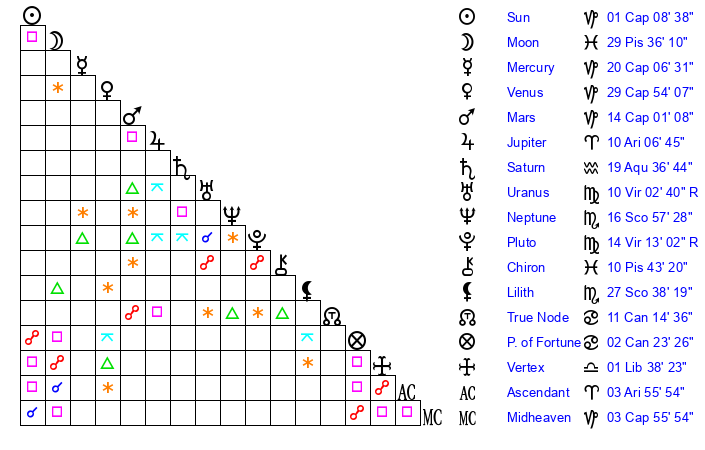 | Sun | 1 Capricorn 9 | 2 Capricorn 7 | 4 Pisces 7 |