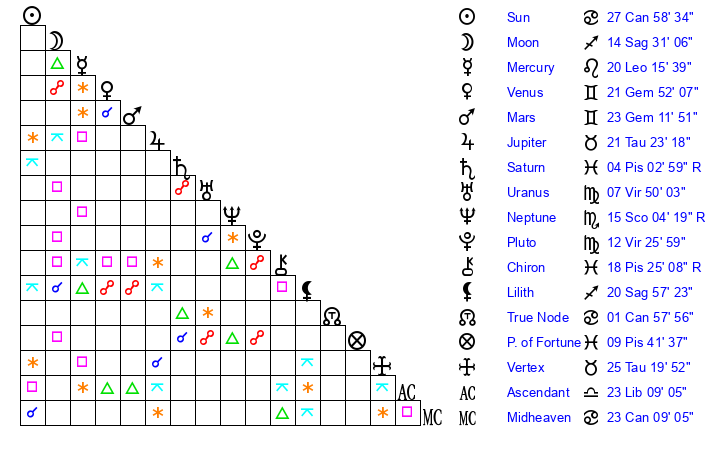 | Moon | 14 Sagittarius 35 | 3 Gemini 54 | 1 Pisces 58 |