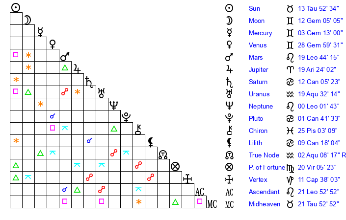 | Sun | 13 Taurus 52 | 14 Taurus 29 | 28 Leo 16 |