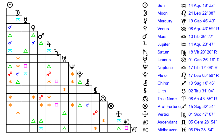 | Jupiter | 14 Aquarius 19 | 11 Gemini 16 | 0 Pisces 41 |