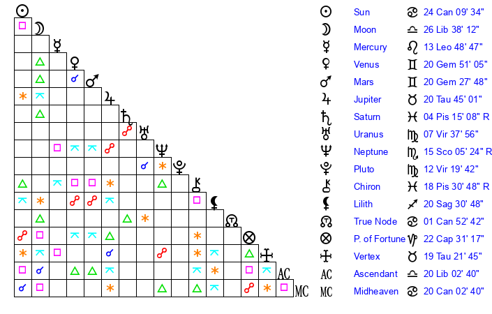 | Moon | 26 Libra 51 | 7 Aries 7 | 12 Capricorn 38 |