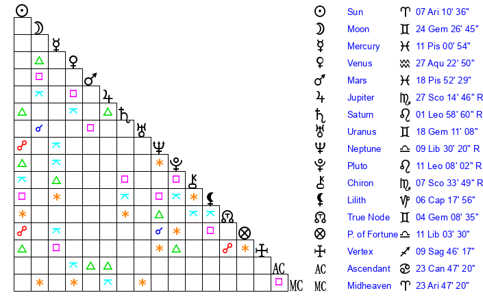 | Jupiter | 27 Scorpio 7 | 15 Gemini 29 | 18 Scorpio 59 |