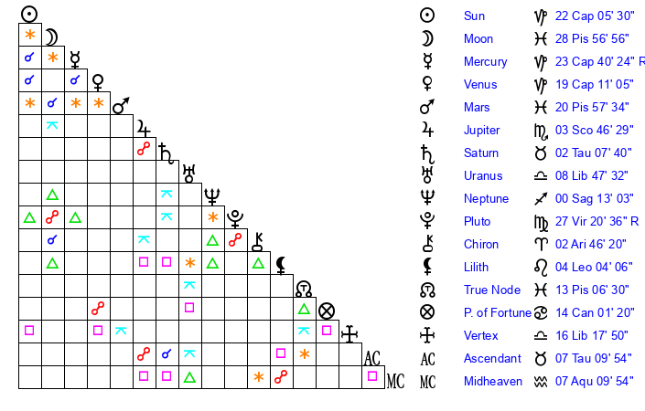 | Venus | 19 Capricorn 11 | 9 Pisces 53 | 28 Pisces 7 |