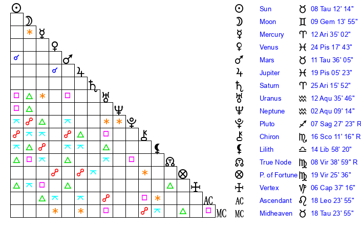 | Sun | 8 Taurus 12 | 8 Taurus 39 | 4 Gemini 17 |